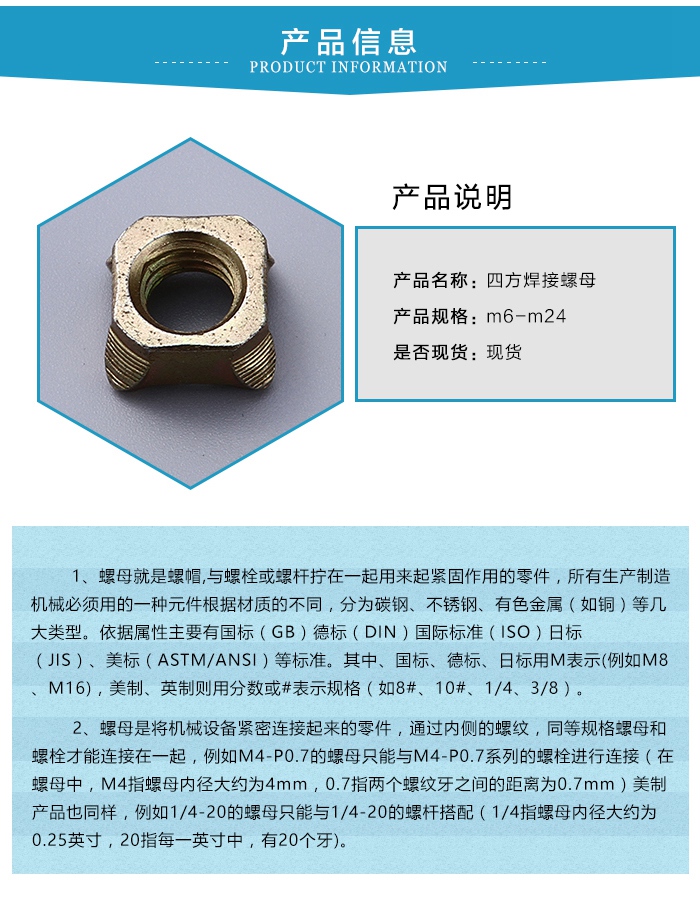 四方焊接螺母是被焊工件的材质(同种或异种),通过加热或加压或两者并用,并且用或不用填充材料,使工件的材质达到原子间的建和而形成性连接的工艺过程, 焊接螺母是具有内螺纹并与螺栓配合使用的紧固件。具有内螺纹并与螺杆配合使用用以传递运动或动力的机械零件。